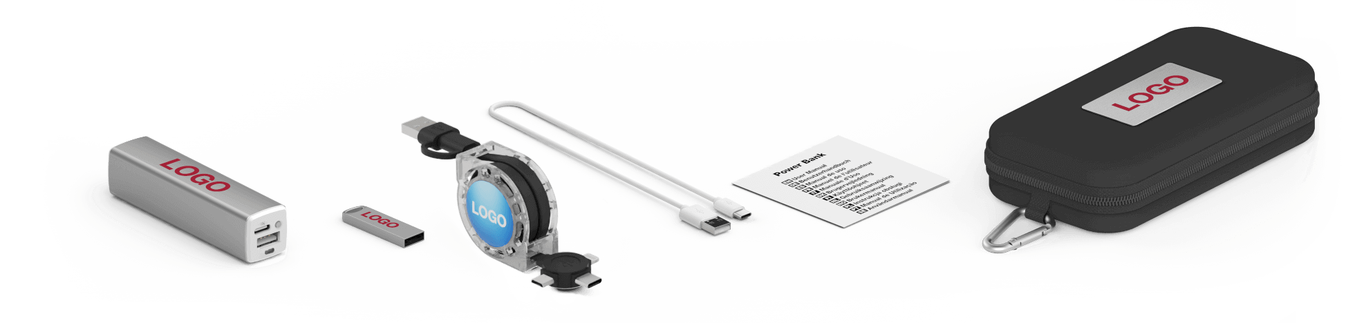 集合3產品在一個方便的旅行禮品套裝: Focus USB手指, Element 行動電源, Motion